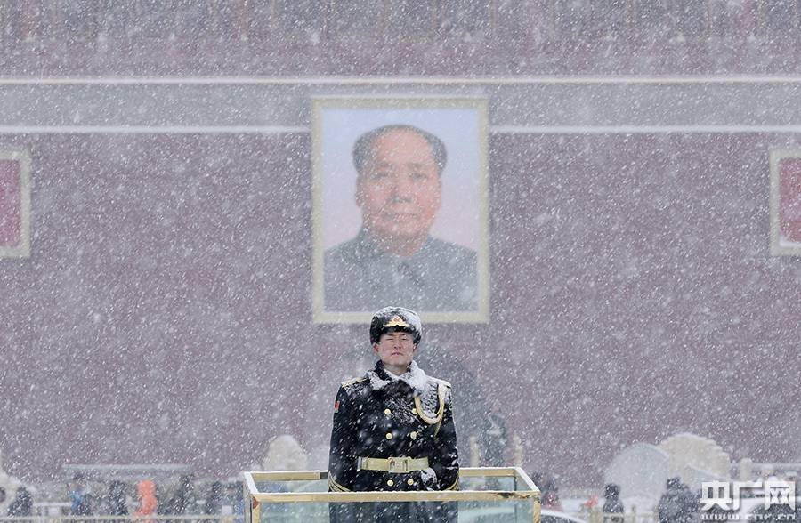2月12日,北京降雪,天安門廣場上,正在雪中執(zhí)勤的哨兵。央廣網記者 韓靖 攝