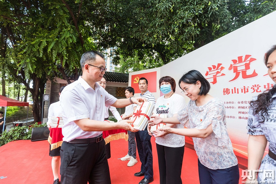 贈(zèng)送黨史學(xué)習(xí)教育書籍。(央廣網(wǎng)發(fā) 王偉楠攝)