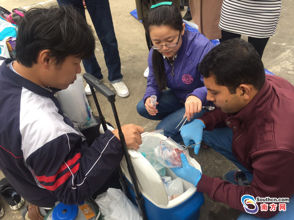 有專家在現(xiàn)場稱,“解剖發(fā)現(xiàn)有乳汁,這是一頭哺乳期母鯨”。據(jù)悉,解剖取樣可能持續(xù)到明天結(jié)束 。專家將對抹香鯨開展生理結(jié)構(gòu)、分子生物學(xué)、生態(tài)及病理等方面的研究工作,分析死因,以期為抹香鯨這一瀕危種群的保護(hù)提供更多具有科學(xué)價值的數(shù)據(jù)和理論。圖為來自汕頭大學(xué)的專家在對抹香鯨的乳腺取樣。