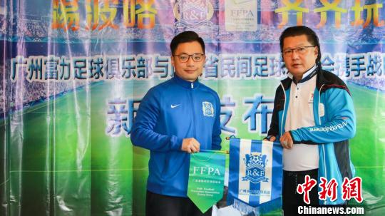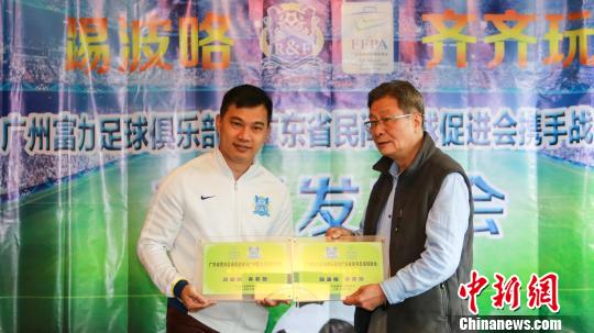 容志行(圖右)代表廣東民促會互贈“廣東省民間足球促進(jìn)會與廣州富力足球俱樂部攜手戰(zhàn)略合作”牌匾!≡莱彙z
