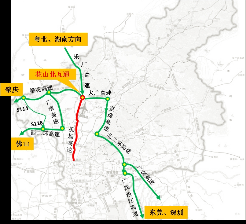 往肇慶方向的車輛:樂廣高速(花山北互通立交)—肇花高速—肇慶方向