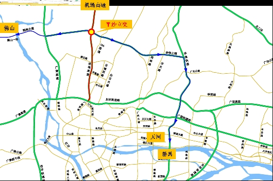 往天河、番禺方向的車輛:機(jī)場(chǎng)高速(平沙立交)—華快三期—華南快速—天河、番禺方向。