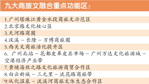 廣州市商務委副主任楊勇在論壇上首度公開了廣州市促進商旅文融合發(fā)展的戰(zhàn)略規(guī)劃,其透露廣州市將打造廣州商旅文融合發(fā)展九大功能區(qū),其中包括了廣州塔珠江黃金水段商旅文示范區(qū)、北京路文化核心區(qū)、天河路商圈、漢溪-長隆-萬博商旅圈、西關(guān)文商旅活化提升區(qū)、廣州北站-花都皮革皮具市場-廣州萬達文化旅游城-空港經(jīng)濟產(chǎn)業(yè)帶、黃埔海絲之路文化旅游商貿(mào)合作區(qū)、白云新城-三元里-流花路商旅帶、從化溫泉-流溪河商旅文體生態(tài)合作區(qū)。