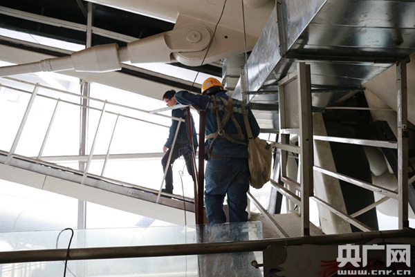 “廣州南站南北雨棚距站臺(tái)面高達(dá)26米,大型登高設(shè)備無法進(jìn)入,車間現(xiàn)有12米登高車,但高度遠(yuǎn)遠(yuǎn)不足,雨棚吊頂末設(shè)置修檢通道,換燈危險(xiǎn)系數(shù)極高!惫偶褬(biāo)說。