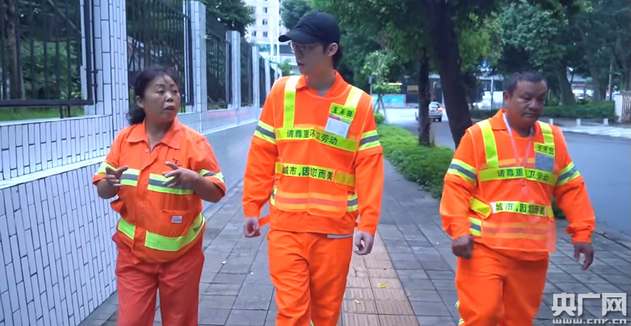 新媒體創(chuàng)作者體驗環(huán)衛(wèi)工作。(央廣網(wǎng)發(fā) 張?zhí)貎r供圖)