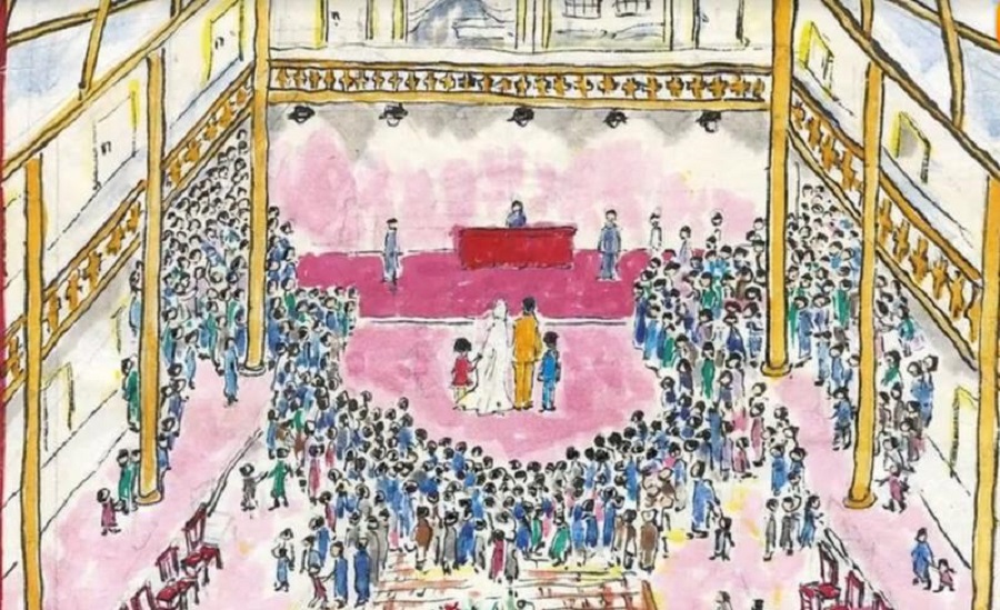 但其實最初,高春霞并不了解兩位老人的愛情故事。直到老人的五位子女找到她,帶著《平如美棠》那本書,她無意中翻時才知道這是非常平凡而相親相愛的一家。根據(jù)書中饒平如畫的一張夫婦倆當(dāng)年在大禮堂結(jié)婚的圖片,高春霞萌生了“用還原兩位逝者婚禮的形式”來舉行合靈儀式的想法。