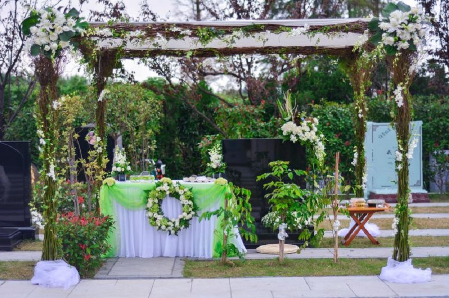白玫瑰,綠帳幔,小風(fēng)鈴,水晶吊墜,羅馬柱,以及用若干老照片做成的“時光通道”,上面是一對夫婦從黑發(fā)到白頭的合影留念。如果沒有看到桌面上擺放的兩只靈盒,許多人可能會誤以為這是一對金婚夫婦的紀(jì)念日現(xiàn)場,畢竟鮮少有人能將這些唯美而溫馨的元素與葬禮聯(lián)系到一起。