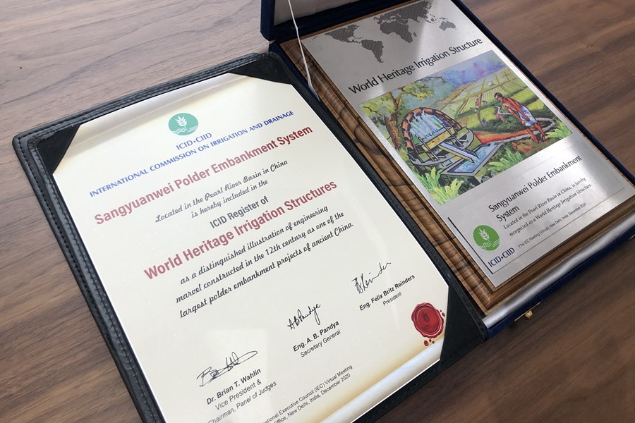 桑園圍工程獲頒世界灌溉工程遺產(chǎn)證書和牌匾。(央廣網(wǎng)發(fā) 陳寧靜攝)