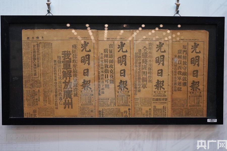 展覽共展出了一百?gòu)垙V州紅色史跡新舊照片和近百件(套)歷史物件。圖為《光明日?qǐng)?bào)》頭版報(bào)道解放廣州的系列報(bào)道。(央廣網(wǎng)記者 官文清 攝)