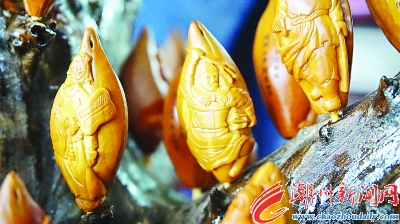 “核雕是一門減法藝術(shù),制作核雕,要經(jīng)歷選料、構(gòu)圖、打型、細(xì)雕、磨磋等十余道工序,工藝繁瑣,做工考究,每道工序都馬虎不得!痹卩嵙紭秀@研了近十年的工作臺上,一盞燈、一臺放大鏡、一枚欖核、數(shù)十把刻刀……通過刻、撥、挑、鉆、削等多種技法雕刻,一個個其貌不揚(yáng)的烏欖核,在他的手中成了一件件精美的藝術(shù)品。