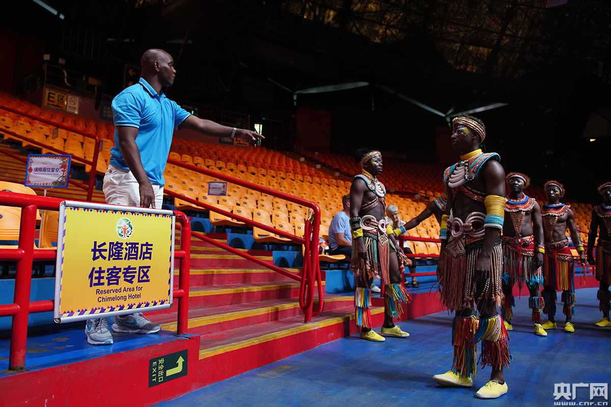 作為大馬戲的串場節(jié)目之一,每當夜幕降臨,在觀眾席的過道上,有這么一群人在其中載歌載舞。其中一項節(jié)目便是肯尼亞舞蹈節(jié)目,該節(jié)目領(lǐng)隊丹尼斯(肯尼亞籍),今年45歲,在長隆生活已經(jīng)10年有余,能夠熟練用中文和廣東話與人交流,妻子杰夫妮(肯尼亞籍)常年伴隨左右,他們有一個21歲的女兒安吉娜,現(xiàn)在也在中國生活。