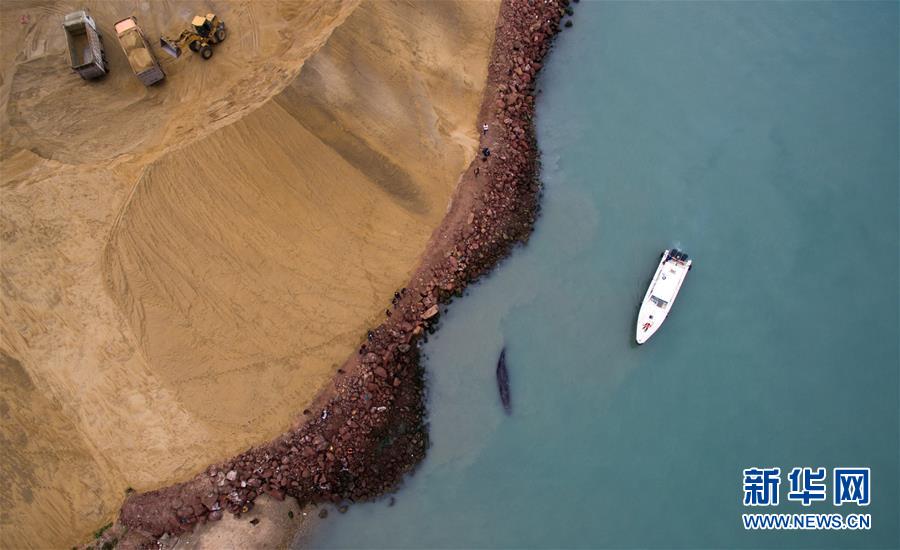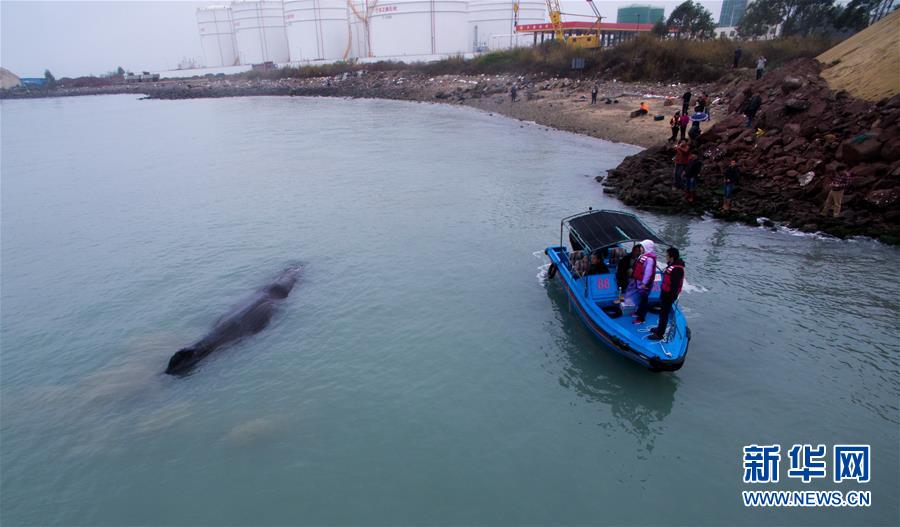 3月14日,在惠州港油庫碼頭附近海域,搭載著專家和漁政工作人員的船只停在抹香鯨旁。新華社記者 毛思倩 攝
