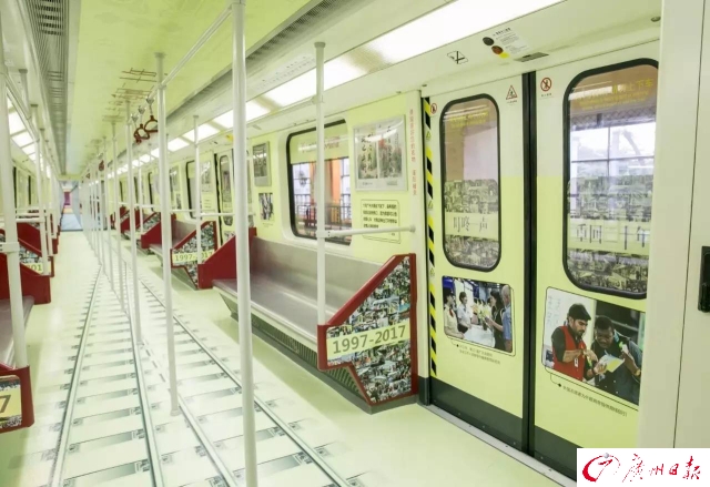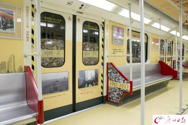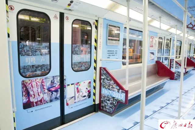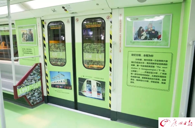 為了慶祝開通運營20周年,廣州地鐵第一列車(一號線0102車)變身“回憶專列”,再次上線服務(wù)。1997年4月10日,一號線0102車從德國運抵廣州黃埔港。20年來,黃色的外表、“叮咚叮咚”的關(guān)門聲音,都成為市民生活的一部分。
