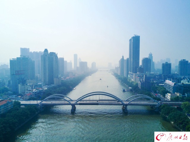 晴天中的解放橋。廣報記者 陳憂子/攝 說起廣州市解放橋,很多人腦海中第一浮現(xiàn)的,便是它的標(biāo)志性三拱橋。 -