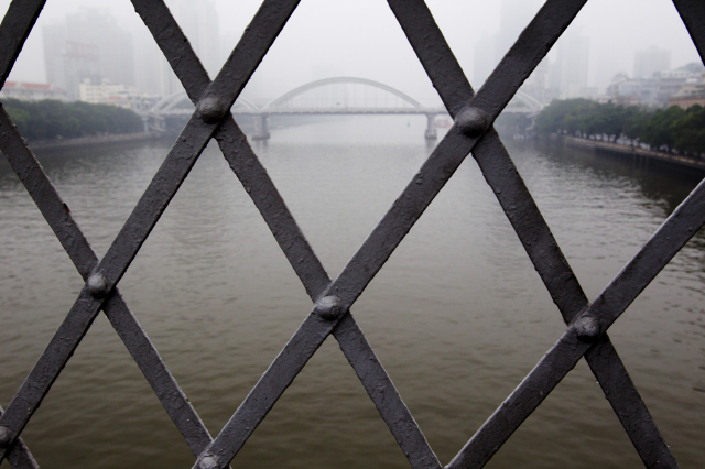 透過海珠橋的鋼筋圍欄,看解放橋。廣報記者 莊小龍/攝 -