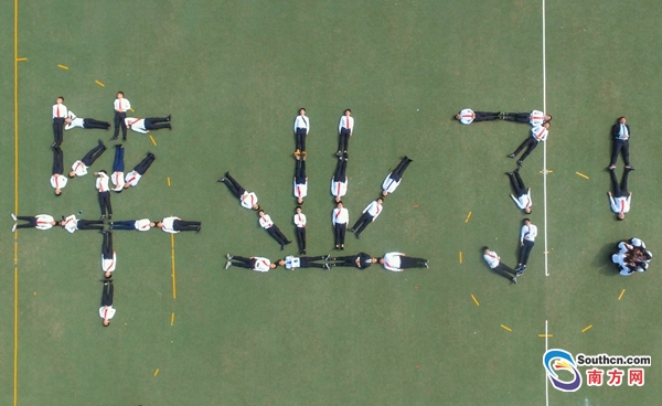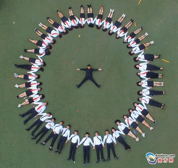 集體大合照結束后,學生們分散到校園各個角落拍照。在經世廣場,校方提供了巨型“學生證”等展板供學生合影。在足球場,一些學生平躺在操場擺出“畢業(yè)了”的造型,換一個視角定格即將逝去的大學青春時光。