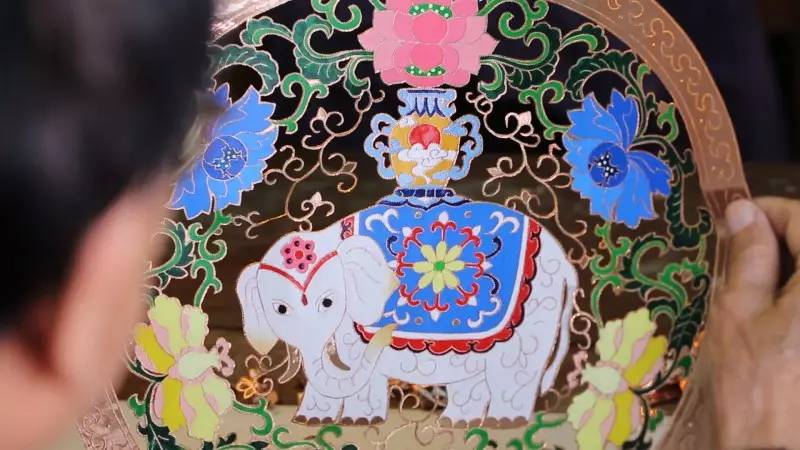 銅鑿剪紙就將薄似紙的銅箔一疊疊起來,再用鑿的珠刀,一點(diǎn)一點(diǎn)地將剪紙的圖案鑿出來,鑿?fù)曛辄c(diǎn)以后,再根據(jù)圖案不同的形象填上不同的色彩。