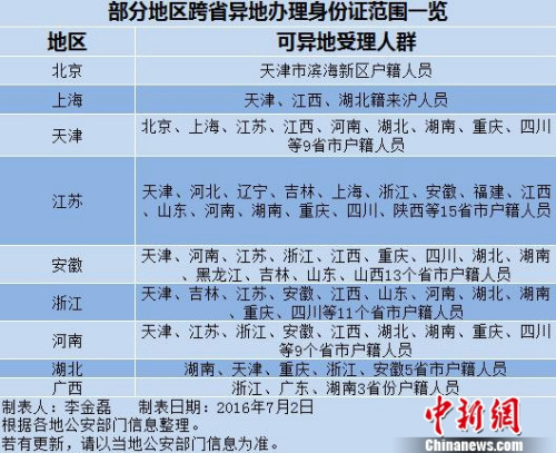 部分地區(qū)跨省異地辦理身份證范圍一覽。中新網(wǎng)記者 李金磊 制圖
