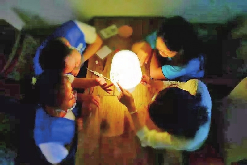 孩子們圍著做好的花燈總結(jié)得失。