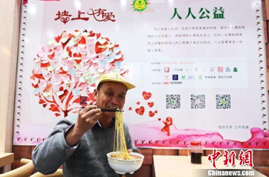 蘭州本地5家牛肉面連鎖品牌加入“墻上有愛(ài),人人公益”愛(ài)心牛肉面活動(dòng)。用餐的人提前購(gòu)買牛肉面,將購(gòu)得的小票貼在墻上并寫上祝福語(yǔ),任何一位需要就餐卻遇到困難的食客,都可以將墻上的小票撕下來(lái)交到收銀臺(tái),免費(fèi)享用牛肉面。圖為活動(dòng)園地!钇G敏 攝