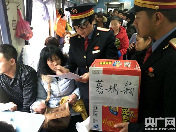 南京開往昆明的K155次列車上,列車長(zhǎng)王華組織旅客募捐。