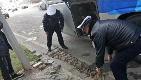 25日,護送交警正在給運送學(xué)生的大巴車安裝防滑鏈。