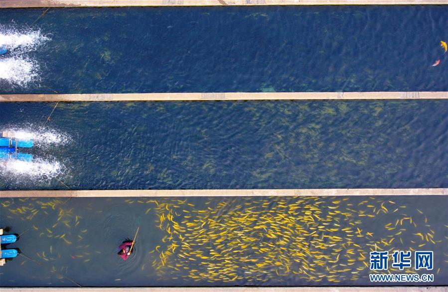 山西省平定縣娘子關(guān)鎮(zhèn)坡底村村民李海芳在養(yǎng)殖合作社內(nèi)撈魚(2月27日無人機(jī)拍攝)。