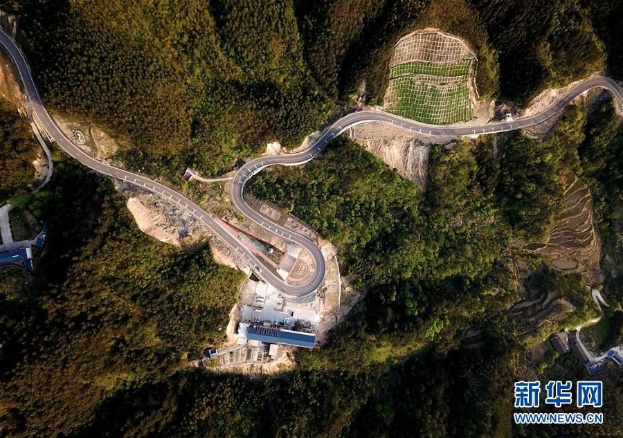 這是在霍山縣太陽鄉(xiāng)拍攝的大別山旅游扶貧快速通道(4月18日無人機(jī)拍攝)。