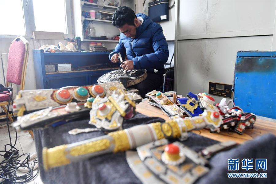 在200米之外的雕刻培訓(xùn)班工作室,家族第七代金銀匠傳承人索南扎西正用小錘輕輕敲打著銀器。他對(duì)學(xué)生們的初期成果不甚滿意,試圖達(dá)到自己的出品標(biāo)準(zhǔn)。既是培訓(xùn)教師,又是曲麻萊縣康朵諾澤藏族工藝品有限公司法人的他,出品的一把藏刀,可以賣(mài)到2萬(wàn)元。
