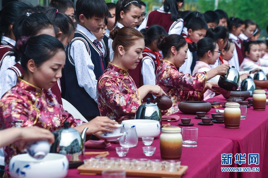 4月20日,水口鄉(xiāng)中心小學(xué)擁有茶藝師證的老師們?cè)诮o學(xué)生示范傳統(tǒng)茶藝。當(dāng)日,浙江省長(zhǎng)興縣水口鄉(xiāng)中心小學(xué)舉辦校園特色“茶文化日”,全校700多名學(xué)生參與包括采茶、紫砂壺制作、茶藝表演等活動(dòng),讓孩子們從小學(xué)習(xí)、傳承傳統(tǒng)茶文化。新華社記者 徐昱 攝