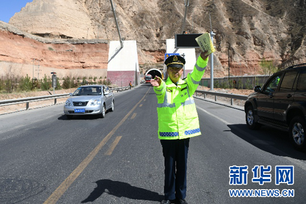 4月2日,路政執(zhí)法部門工作人員在折達公路考勒隧道入口處引導(dǎo)車輛。新華社記者 陳斌 攝