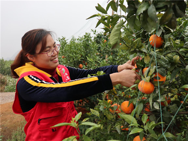 陳金蓮在果園摘收柑橘(央廣網(wǎng)發(fā) 江梨莉攝)