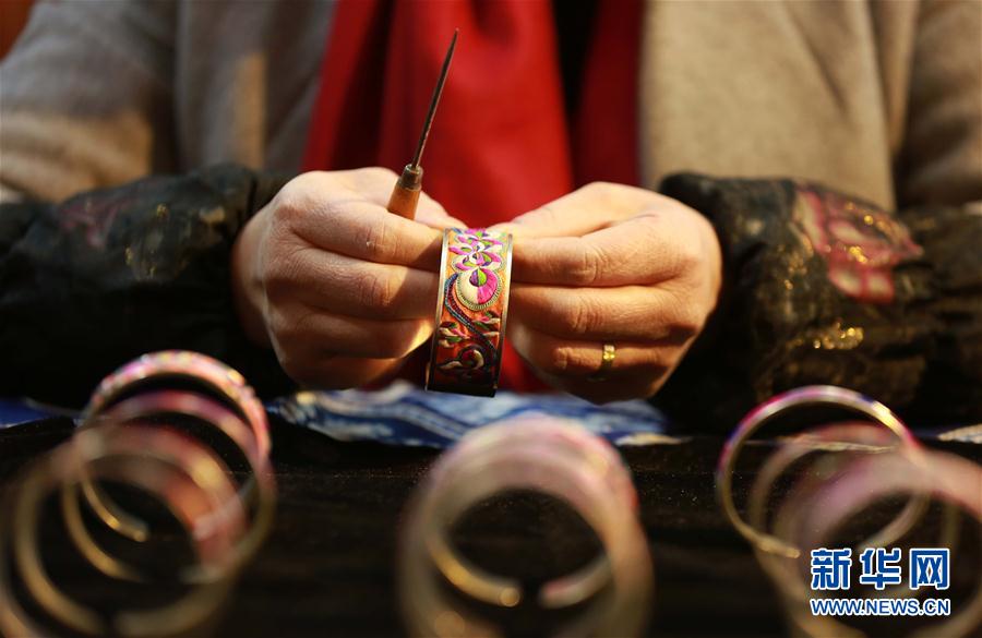 2月6日,在貴州省黎平縣一家手工銀飾店,侗族繡娘丁明煥組裝創(chuàng)意刺繡銀飾手鐲。近年來,貴州省黔東南苗族侗族自治州黎平縣大力發(fā)展文化創(chuàng)意產(chǎn)業(yè),鼓勵(lì)和扶持當(dāng)?shù)乩C娘、手工藝人把民族刺繡、銀飾等設(shè)計(jì)成為具有當(dāng)?shù)匚幕厣纳唐罚瑤?dòng)群眾致富增收。新華社發(fā)(楊代富 攝)