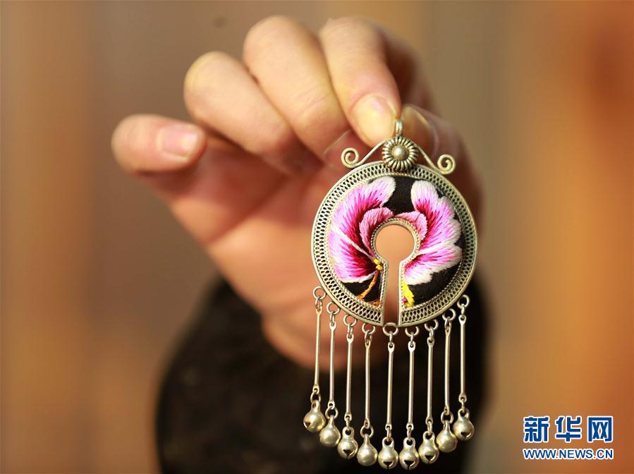 2月6日,在貴州省黎平縣一家手工銀飾店,侗族繡娘丁明煥展示創(chuàng)意刺繡銀飾耳環(huán)。近年來,貴州省黔東南苗族侗族自治州黎平縣大力發(fā)展文化創(chuàng)意產(chǎn)業(yè),鼓勵(lì)和扶持當(dāng)?shù)乩C娘、手工藝人把民族刺繡、銀飾等設(shè)計(jì)成為具有當(dāng)?shù)匚幕厣纳唐,帶?dòng)群眾致富增收。新華社發(fā)(楊代富 攝)