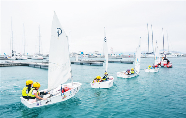 三亞半山半島帆船港附近海域,孩子們?cè)趯W(xué)習(xí)操作帆船。 本報(bào)記者 武威 通訊員 董香云 攝