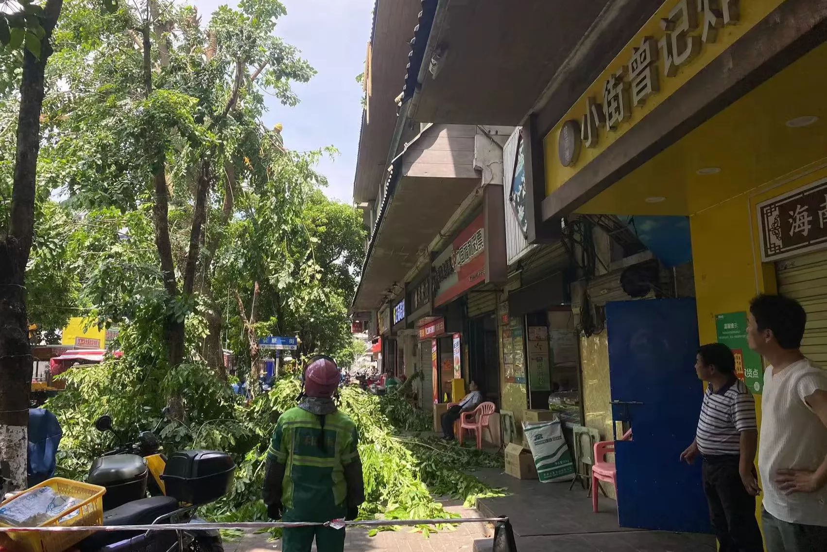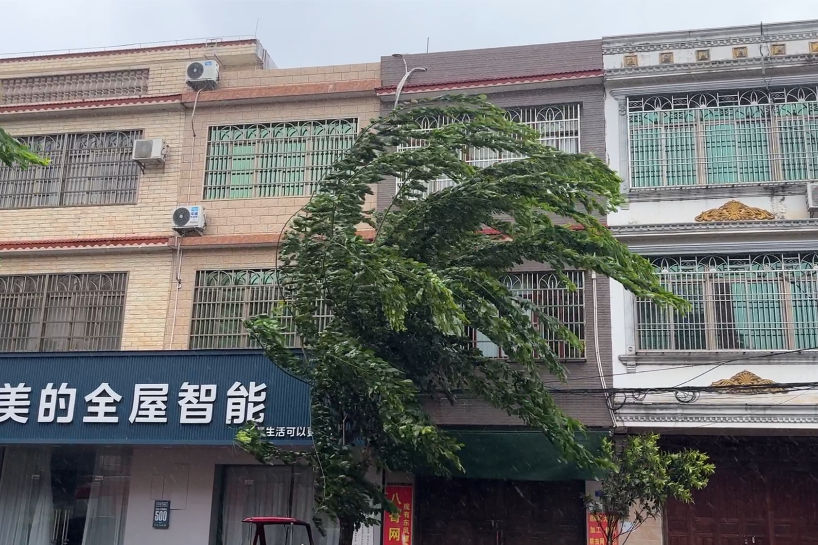 文昌市狂風(fēng)大作,廣告牌飛舞、樹木倒塌。
