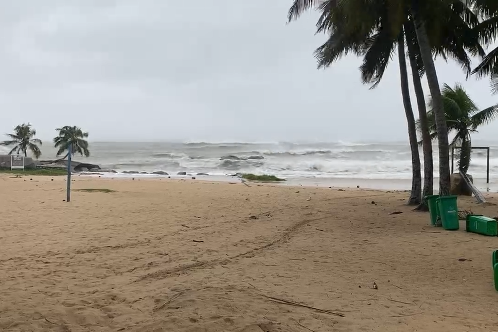 記者在海邊看到巨浪翻滾、狂風(fēng)驟雨。