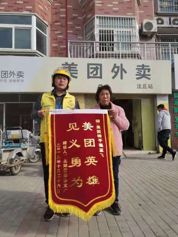10月26日,河南省周口市沈丘縣美團(tuán)外賣(mài)配送中心站的90后騎手連亞飛,在送餐途中路過(guò)沈丘蔡河橋西邊時(shí),發(fā)現(xiàn)一騎三輪車(chē)婦女突然失控,大人小孩連人帶車(chē)一起掉到河里,他奮不顧身跳入河中救起2人。救人的事跡傳開(kāi)后,連亞飛成了方圓數(shù)里的“紅人”,10月28日,共青團(tuán)沈丘縣委授予他“見(jiàn)義勇為好青年”榮譽(yù)稱(chēng)號(hào),美團(tuán)外賣(mài)平臺(tái)授予他“模范騎手”榮譽(yù)稱(chēng)號(hào)和800元現(xiàn)金獎(jiǎng)勵(lì)。
