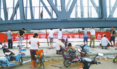 8日下午6時(shí)許,記者在南水北調(diào)焦作段政二街過渠大橋上看到,不少垂釣者用根海桿伸向南水北調(diào)干渠里釣魚,橋上的西側(cè)聚了許多看稀罕的人,機(jī)動(dòng)車道上停了許多電動(dòng)車和3輛轎車,幾乎占?jí)簷C(jī)動(dòng)車道的三分之一路面(上圖),路中央疾駛的車輛路過這里只好橫壓黃線才能通過。