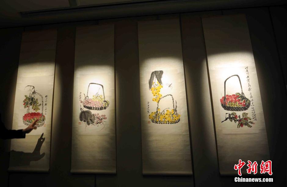 央廣網(wǎng)河南分網(wǎng)消息 據(jù)中新網(wǎng)報(bào)道:3月18日,估價(jià)逾1200萬(wàn)港元的齊白石《菓品四屏》在香港蘇富比傳媒預(yù)展中展出。香港蘇富比中國(guó)書畫2014年春季拍賣會(huì)將于4月會(huì)展舉行。其中包括來(lái)自歐美收藏之張大千、吳昌碩、傅抱石、徐悲鴻等的書畫。中新社發(fā) 譚達(dá)明 攝