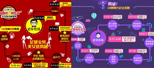 在京美大戰(zhàn)前期,國美在線推出32億現(xiàn)金券PK京東16億優(yōu)惠券,隨后聯(lián)合百度推出1分錢換6聽啤酒暢飲世界杯活動,京東則推出0元玩轉(zhuǎn)萬達(dá)活動,“免費(fèi)”成為了二者這個(gè)促銷階段的共同之處。進(jìn)入6月之后,國美在線提前截流京東3C大促,推出手機(jī)電腦真低價(jià)活動,時(shí)間比京東提前了1天。接下來,二者主打的品類皆為家電、服裝,最后,雙方最高層領(lǐng)導(dǎo)將為自家商城站臺,以“老牟專場”與“老劉專場”的對決形式展現(xiàn)。