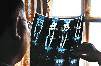 大夫查看鄭鋸?fù)戎搬t(yī)院給他拍攝的X光片