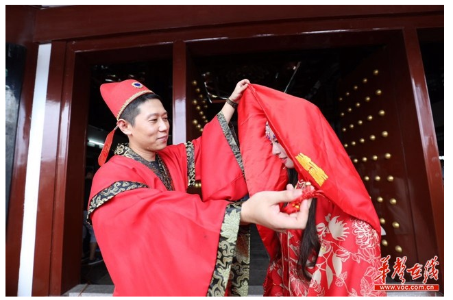 當天下午,杜甫江閣上身著盛裝的“漢代小姐”款款移步繡樓檻前,含情脈脈地在眾人中搜尋一番后,最終將目光落在心儀的“郎君”身上,隨后面帶幾分羞澀,將手中的繡球凌空拋下,折回閨房。參與活動的“郎君”搶到繡球后,疾步登上繡樓。隨后,嗩吶聲四起,“新郎”與“新娘”牽著紅花球從南門口進入,在丫環(huán)的攙扶下,一對“新人”在一片祝福聲中,舉行婚慶儀式。