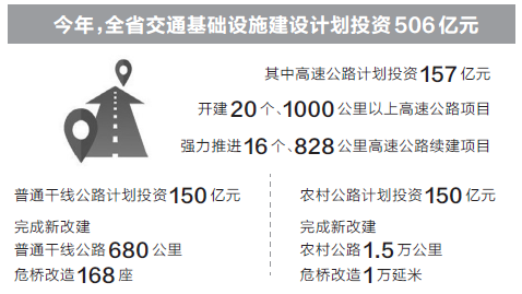 今年,全省交通基礎(chǔ)設(shè)施建設(shè)計劃投資506億元,其中高速公路計劃投資157億元。強(qiáng)力推進(jìn)16個、828公里高速公路續(xù)建項目。普通干線公路計劃投資150億元,重點實施低等級公路升級改造、城鎮(zhèn)過境段建設(shè),完成新改建普通干線公路680公里,危橋改造168座;農(nóng)村公路計劃投資150億元,完成新改建農(nóng)村公路1.5萬公里,危橋改造1萬延米。(記者 董娉)