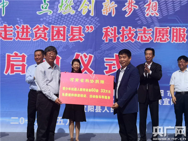 啟動儀式上,房衛(wèi)平、吳廷偉、賀敏等為開展“科普大篷車走進(jìn)伏牛山走進(jìn)貧困縣”科技志愿服務(wù)活動的宜陽縣、汝陽縣、洛寧縣等5個縣授旗。省科協(xié)青少年科技中心組織鄭州昊眾電子科技有限公司等愛心單位,向洛陽市三所中小學(xué)捐贈了60套價值33萬元的機(jī)器人工作室器材設(shè)備,并將為受捐的學(xué)校提供師資培訓(xùn)和活動指導(dǎo)等后續(xù)服務(wù)。為了配合本次活動,河南科技報社精心準(zhǔn)備了10余萬份科技教育學(xué)習(xí)和?,將在活動期間向104所鄉(xiāng)鎮(zhèn)學(xué)校免費發(fā)放。