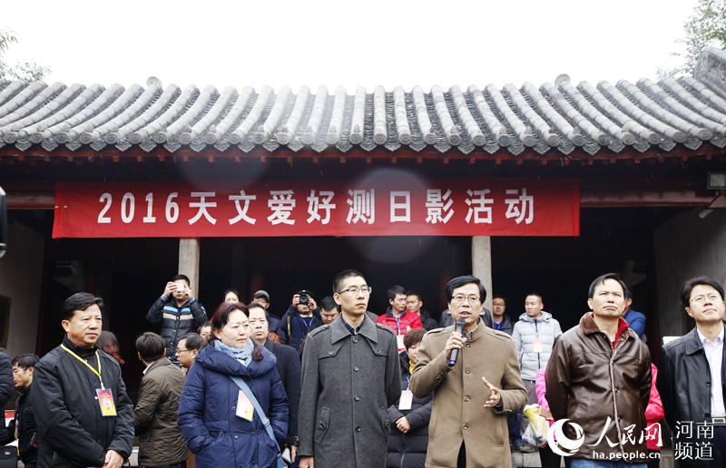 將近午時,十余名天文愛好者采用元代觀天之法,順利利用周公測景臺和元代觀星臺現(xiàn)場測日影定準冬至節(jié)令。經(jīng)測定,觀星臺文管所所長安麗宣布,冬至日觀星臺橫梁太陽高度角32度9分44秒,影長15.6332米,告成正午時間是北京時間12點25分28秒。