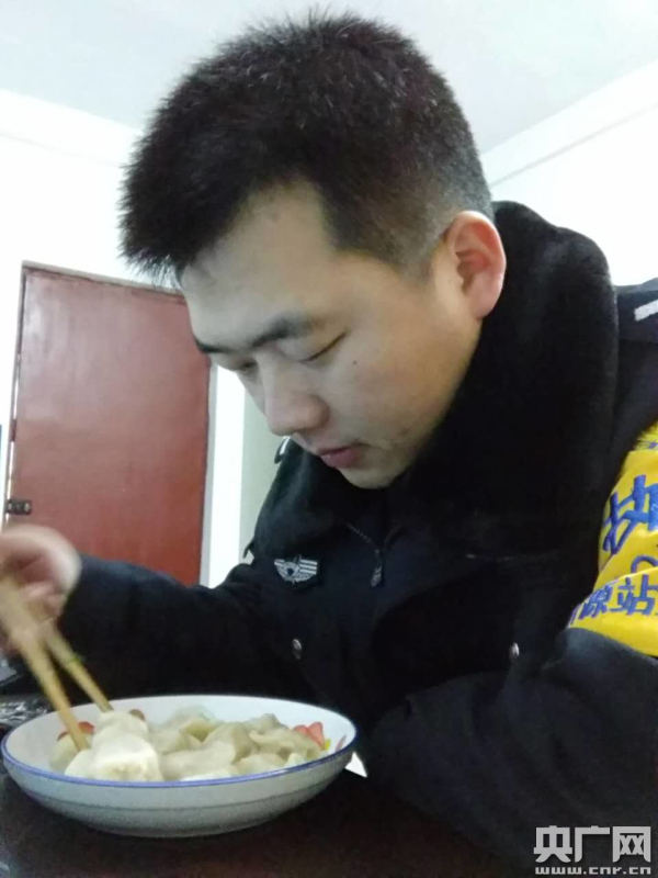 忙碌了一天民警李遠(yuǎn)亮吃碗餃子過(guò)年了