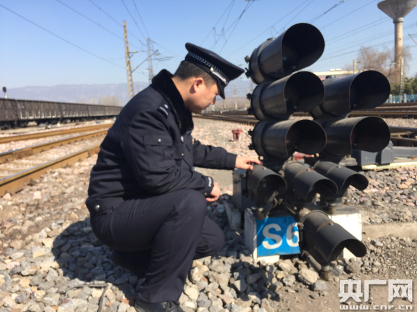 民警李遠(yuǎn)亮檢查信號(hào)設(shè)備是否正常