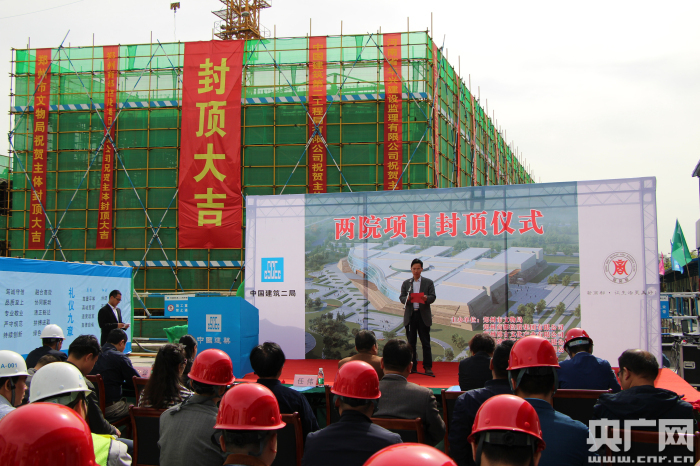 儀式上,中原分公司經(jīng)理崔彥波代表中建二局向前來參加封頂儀式的領(lǐng)導(dǎo)及嘉賓表示了熱烈的歡迎和誠摯的感謝,他說,在各級政府的關(guān)心下,在鄭州商都控股集團的大力支持下,在河南省華興建設(shè)監(jiān)理有限公司,新縣昌榮、四川匯通、河南德匯勞務(wù)公司以及全體員工的共同努力下,項目正式迎來封頂,這標(biāo)志著項目建設(shè)進入新的、更加緊張的階段。他同時表示,將繼續(xù)秉持“過程精品,質(zhì)量重于泰山”的理念,在認(rèn)真落實揚塵治理各項要求,堅持綠色文明施工的同時,搶抓工期,確保安全、優(yōu)質(zhì)、高效地完成“兩院”項目建設(shè)任務(wù)。
