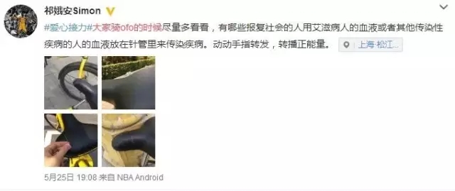 5月底,網(wǎng)上流傳圖片稱,有人在一輛共享單車的坐墊上找到一根針,似有人故意為之!膀T車的時(shí)候請(qǐng)注意查看,有些艾滋病患者把自己的血染到針頭上,要是被扎到你就被感染了!